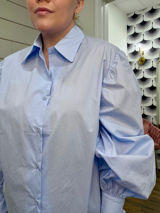 Blue Oxford Puff Sleeve Blouse